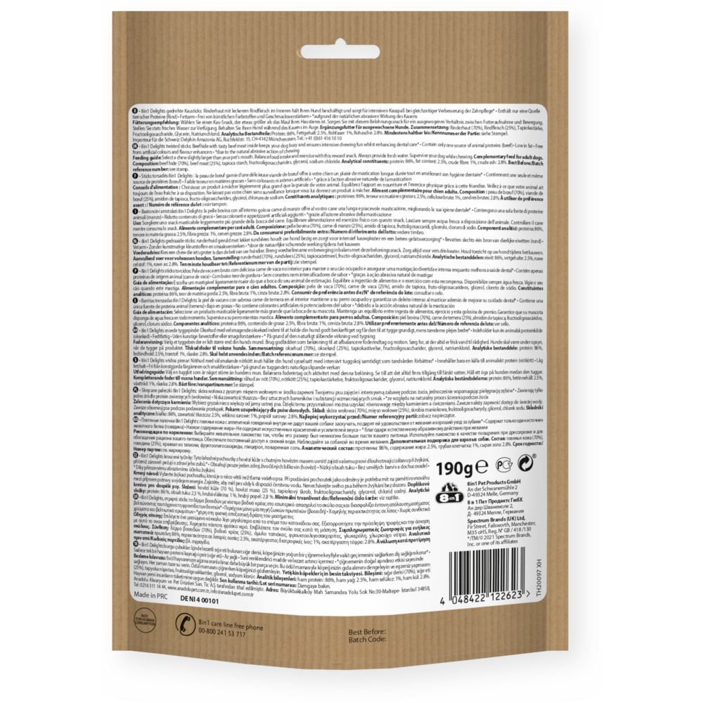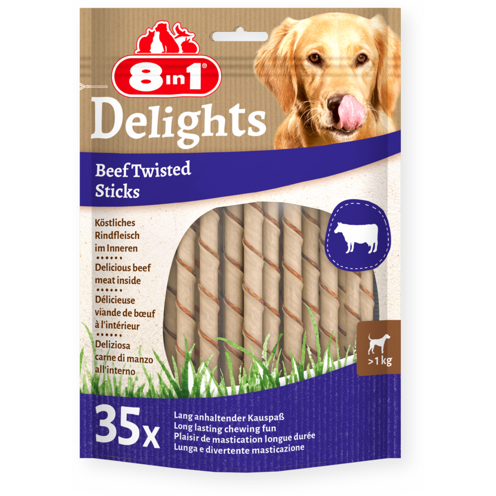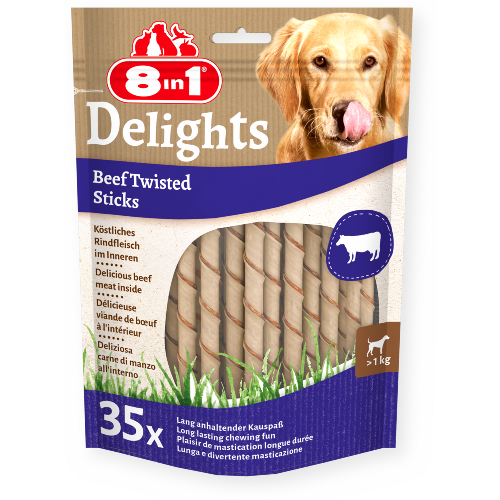 8in1 Delights Beef Twisted Sticks zijn gemaakt van lekkere runderhuid en heerlijk rundvlees en bieden intensief, langdurig kauwplezier voor uw hond. En terwijl de gedraaide sticks uw hond bezighouden, dragen ze bij aan de gebitsverzorging. Door de natuurlijke schurende werking tijdens het kauwen wordt tandsteen bij uw hond verwijderd en daarmee ondersteunen de gedraaide sticks de gebitsgezondheid van uw hond. De vetarme 8in1 Delights Beef Twisted Sticks zijn perfect als smakelijke kauwsnack om uw hond te belonen. Ze zijn rijk aan eiwitten en vrij van kunstmatige kleurstoffen en smaakversterkers. Bovendien zijn er geen suiker, ggo’s, gluten of granen toegevoegd aan de ovengebakken kauwsnacks.