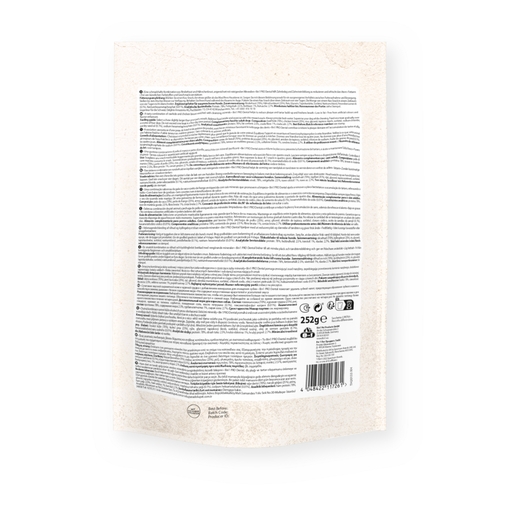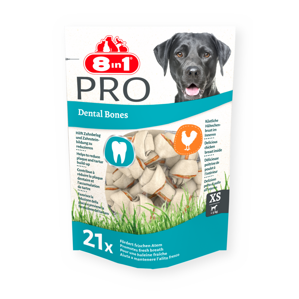 De 8in1 PRO Dental Bones XS zijn de ideale combinatie van langdurig kauwplezier en gebitsverzorging voor honden van zeer kleine rassen! De heerlijke kipfilet is verpakt in stevige runderhuid met toegevoegde anti-tandplakformule en gebitsreinigende mineralen. Deze smakelijke chews helpen de vorming van tandplak en tandsteen te verminderen dankzij de natuurlijke schurende werking van het kauwen en dragen bovendien bij aan een frissere adem. Met deze producten geeft u uw hond een natuurlijke kauwervaring zonder smaakversterkers of kleurstoffen. Deze perfecte combi van kauwplezier en een lekkere snack is ideaal voor tussen de maaltijden door en om verveling tegen te gaan. De 8in1 Pro Dental Bones XS houden uw hond lekker bezig en bieden met elke hap intensief kauwplezier en een verbeterde gebitsverzorging.