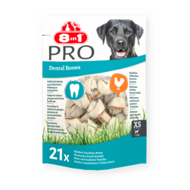 De 8in1 PRO Dental Bones XS helpen de vorming van tandplak en tandsteen te verminderen dankzij de natuurlijke schurende werking van het kauwen. Deze producten worden bereid met een smakelijke combinatie van runderhuid en kipfilet en verrijkt met reinigende mineralen voor een frissere adem.