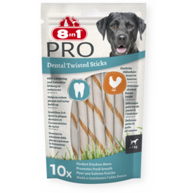 De 8in1 PRO Dental Twisted Sticks helpen de vorming van tandplak en tandsteen te verminderen dankzij de natuurlijke schurende werking van het kauwen. Ze worden bereid met een smakelijke combinatie van runderhuid en kipfilet en verrijkt met reinigende mineralen voor een frissere adem.