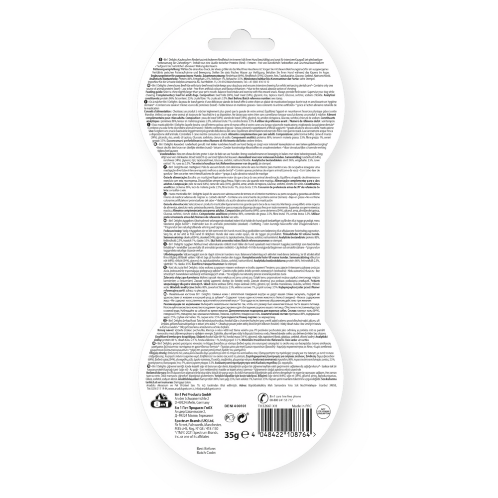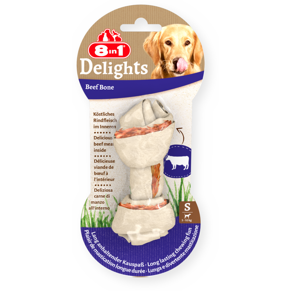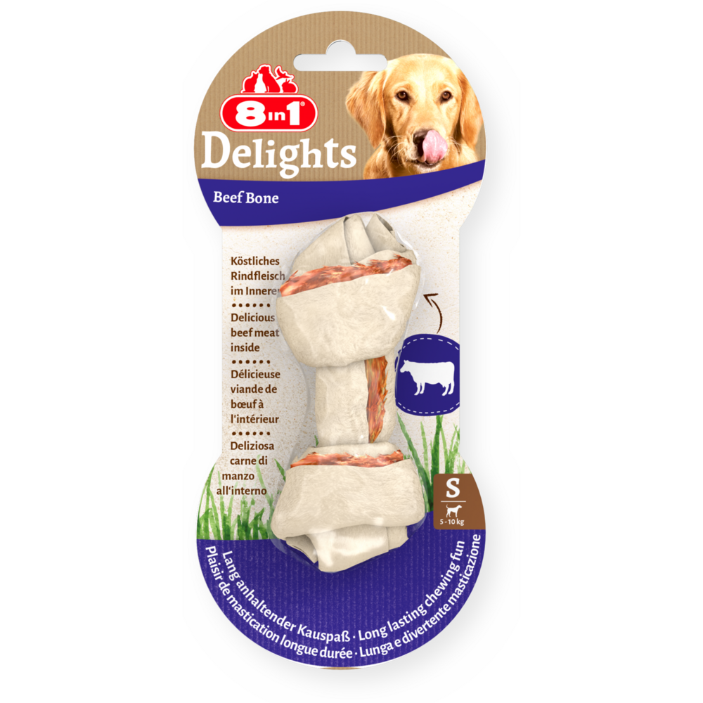 Kości 8in1 Delights Beef Bones S są wykonane ze smacznej skóry wołowej i pysznego mięsa wołowego, co zapewnia małym psom (5-10 kg) intensywną zabawę podczas żucia. Gwarantując psu zajęcie, kości pielęgnują również zęby dzięki naturalnemu procesowi ścierania podczas żucia. Podając niskotłuszczowe przysmaki 8in1 Delights Beef Bones S, możesz nagrodzić swojego psa pieczonym w piekarniku przysmakiem do żucia, który jest bogaty w proteiny, wolny od sztucznych barwników i wzmacniaczy smaku. Bez GMO i glutenu.