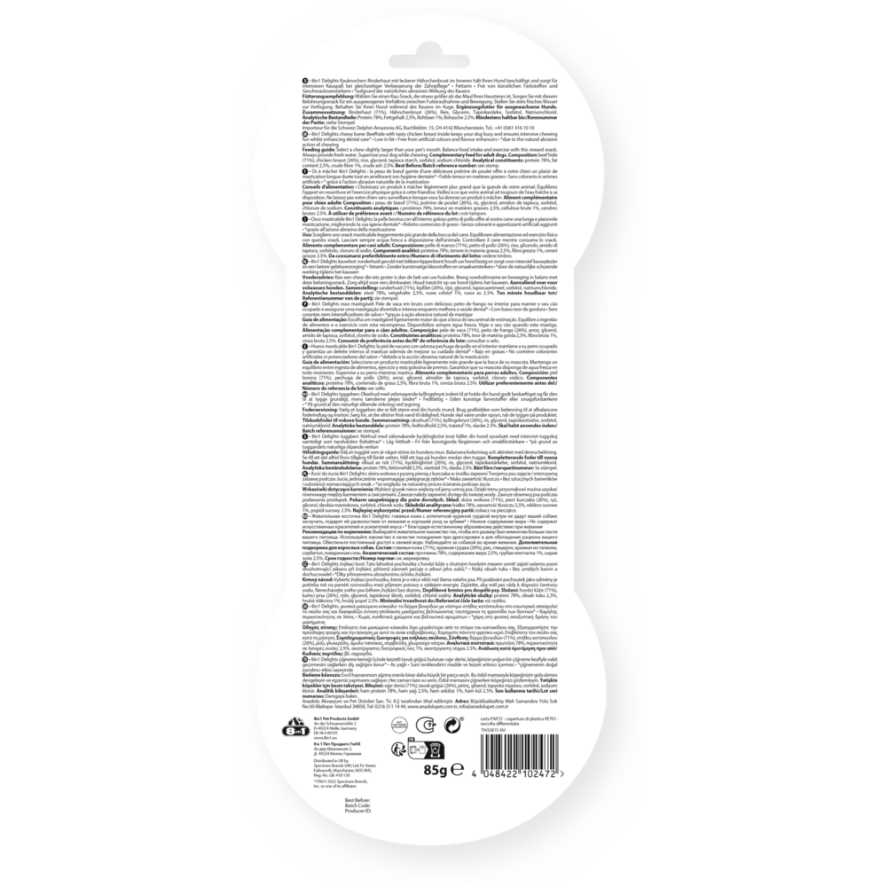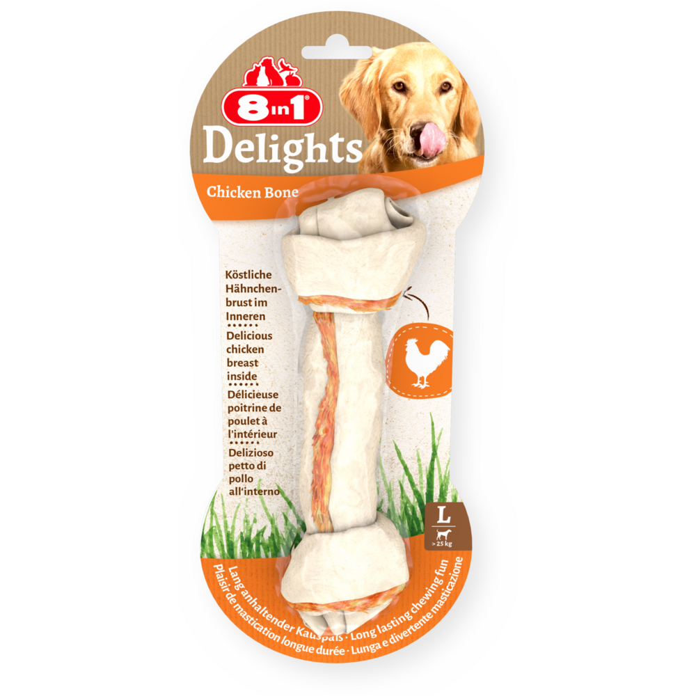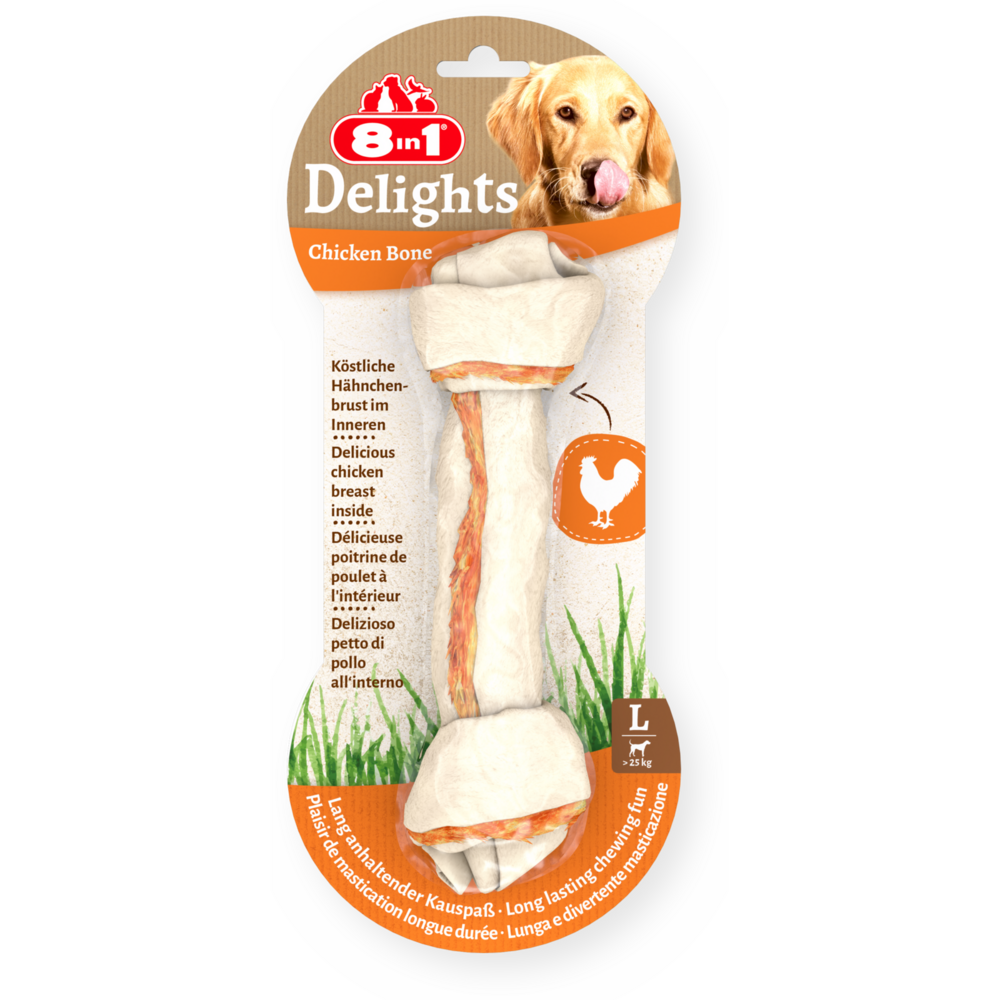 Kości 8in1 Delights Chicken Bones L są wykonane ze smacznej skóry wołowej i pysznej piersi z kurczaka, co zapewnia małym psom (powyżej 25 kg) intensywną zabawę podczas żucia. Gwarantując psu zajęcie, kości pielęgnują również zęby dzięki naturalnemu procesowi ścierania podczas żucia. Podając niskotłuszczowe przysmaki 8in1 Delights Chicken Bones L, możesz nagrodzić swojego psa pieczonym w piekarniku przysmakiem do żucia, który jest bogaty w proteiny, wolny od sztucznych barwników i wzmacniaczy smaku. Bez dodatku cukru, GMO i glutenu.