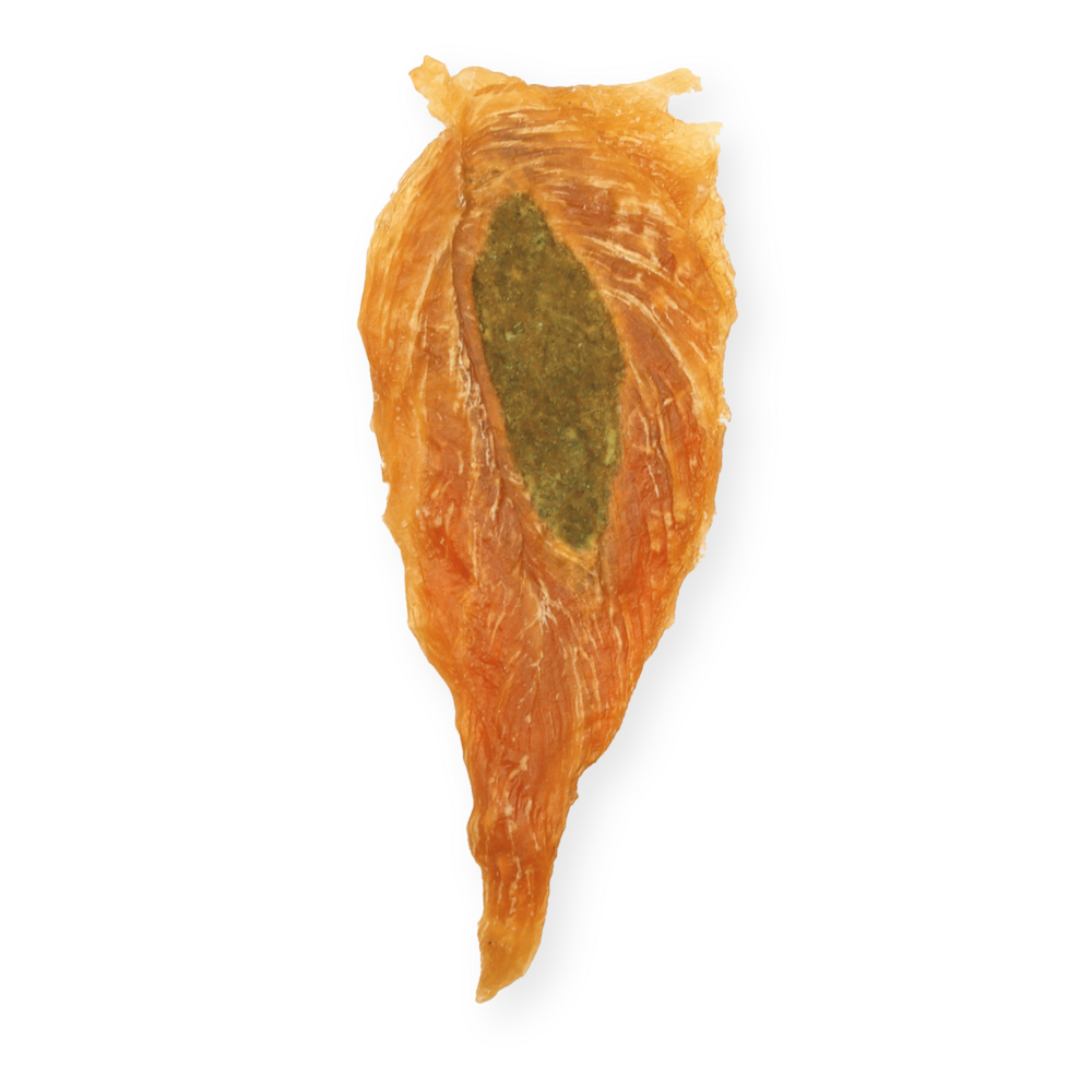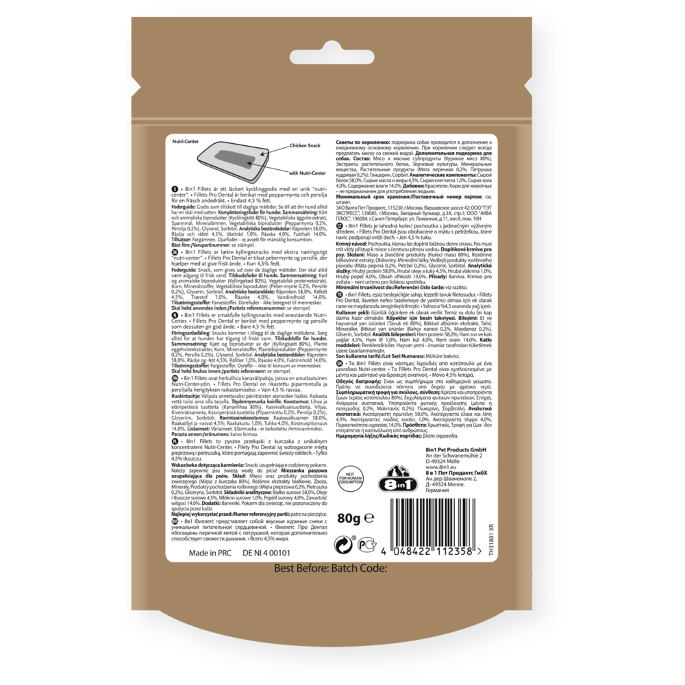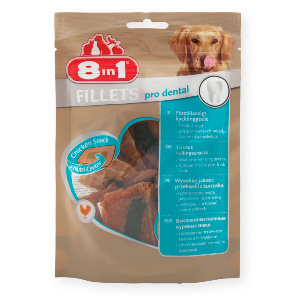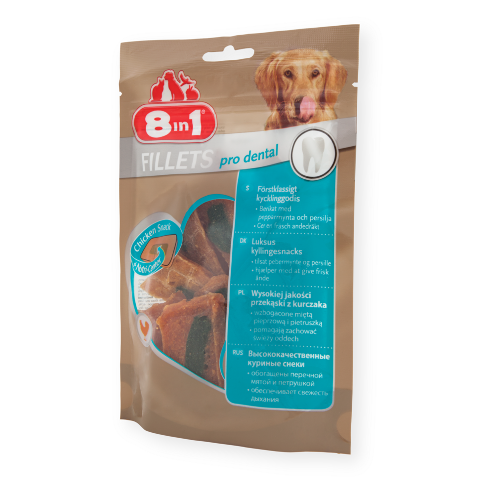 Przysmaki 8in1 Fillets Pro Dental to najwyższej jakości pyszne przekąski dla psów, które dodatkowo odświeżają oddech. Przysmaki 8in1 Fillets Pro to nie tylko wyjątkowy smak i niska zawartość tłuszczu. Dla psa stanowią również pyszną nagrodę ze specjalnym dodatkiem. Przekąski te zawierają smakowite mięso kurczaka ze specjalnym odżywczym nadzieniem, zwanym „Nutri-Centre”, z dodatkowymi składnikami wspierającymi dobre samopoczucie i witalność psa. Unikalny koncentrat Nutri-Centre został wzbogacony o miętę i nasiona pietruszki, które tradycyjnie stosuje się i uznaje za posiadające właściwości odświeżające oddech. 8in1 Fillets Pro Dental zawierają tylko 4,5% tłuszczu i są zdrową nagrodą między posiłkami. Zamykana torebka umożliwia zabranie przekąsek ze sobą, poz dom lub w podróż. 8in1 Fillets Pro są również dostępne w trzech innych odmianach: Pro Active, Pro Digest, i Pro Skin & Coat, aby zaspokoić potrzeby każdego psa.